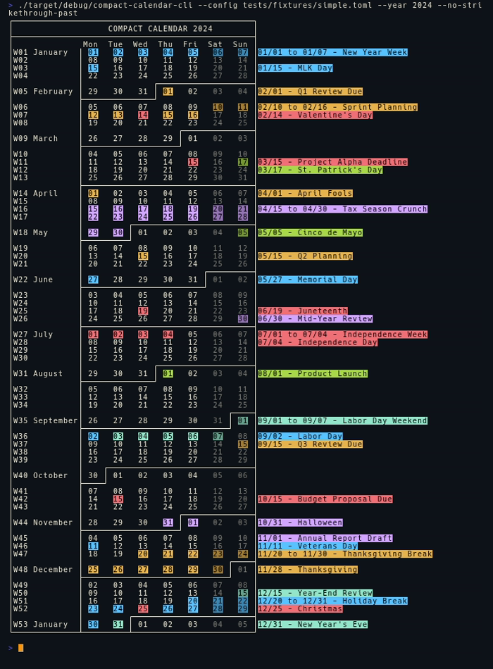 ### compact-calendar-cliCompact year-at-a-glance calendar CLI with TOML-based event highlighting